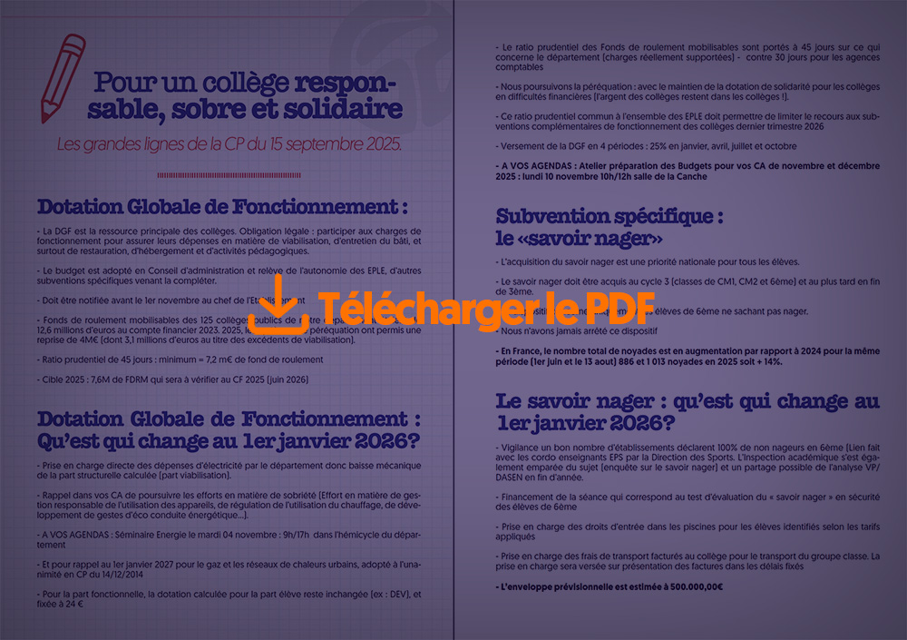 - Fonds de roulement mobilisables des 125 collèges publics de notre département étaient de 12,6 millions d’euros au compte financier 2023. 2025, les systèmes de péréquation ont permis une reprise de 4M€ (dont 3,1 millions d’euros au titre des excédents de viabilisation).